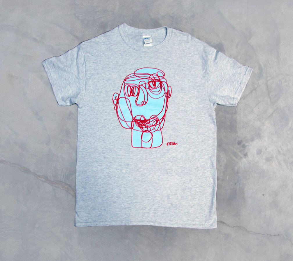 Red Doodle face with baby blue background on heather grey T-shirt